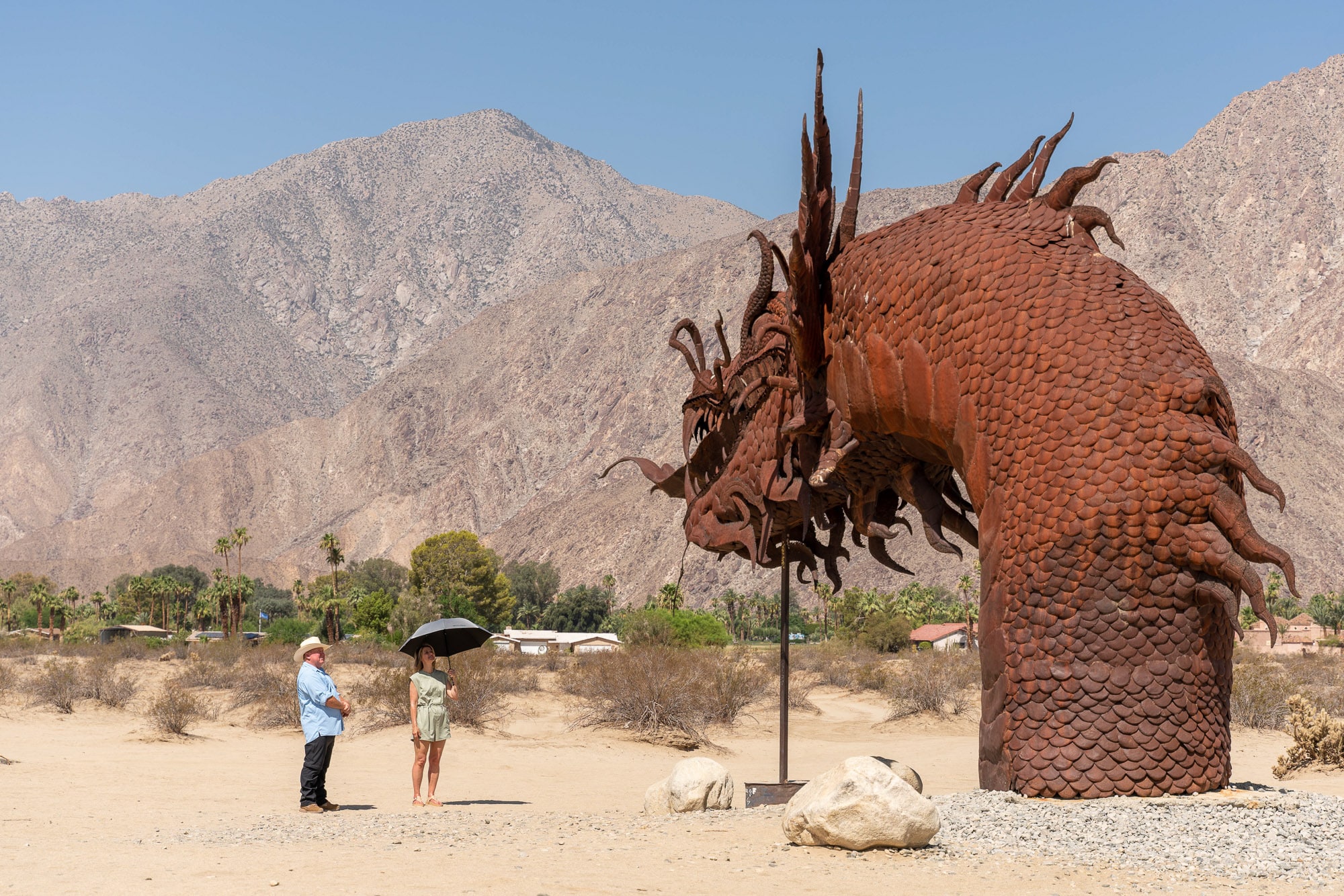 As you leave Borrego Springs, you’re going to feel like you’re hallucinating when you start to see the massive, fantastical metal structures popping up in the desert! Don’t worry, you’re not crazy – these are the Sky Art Sculptures of Borrego Springs. Over 1,500+ acres, there are something like 130 of these metal creatures created by artist Ricardo Breceda. The most epic has to be the 350ft serpent that looks like it’s weaving in and out of the sand. I joined former Borrego Springs mayor, James “Okie” McNatt to learn more about the sculptures and the man who commissioned them, the late Dennis Avery.